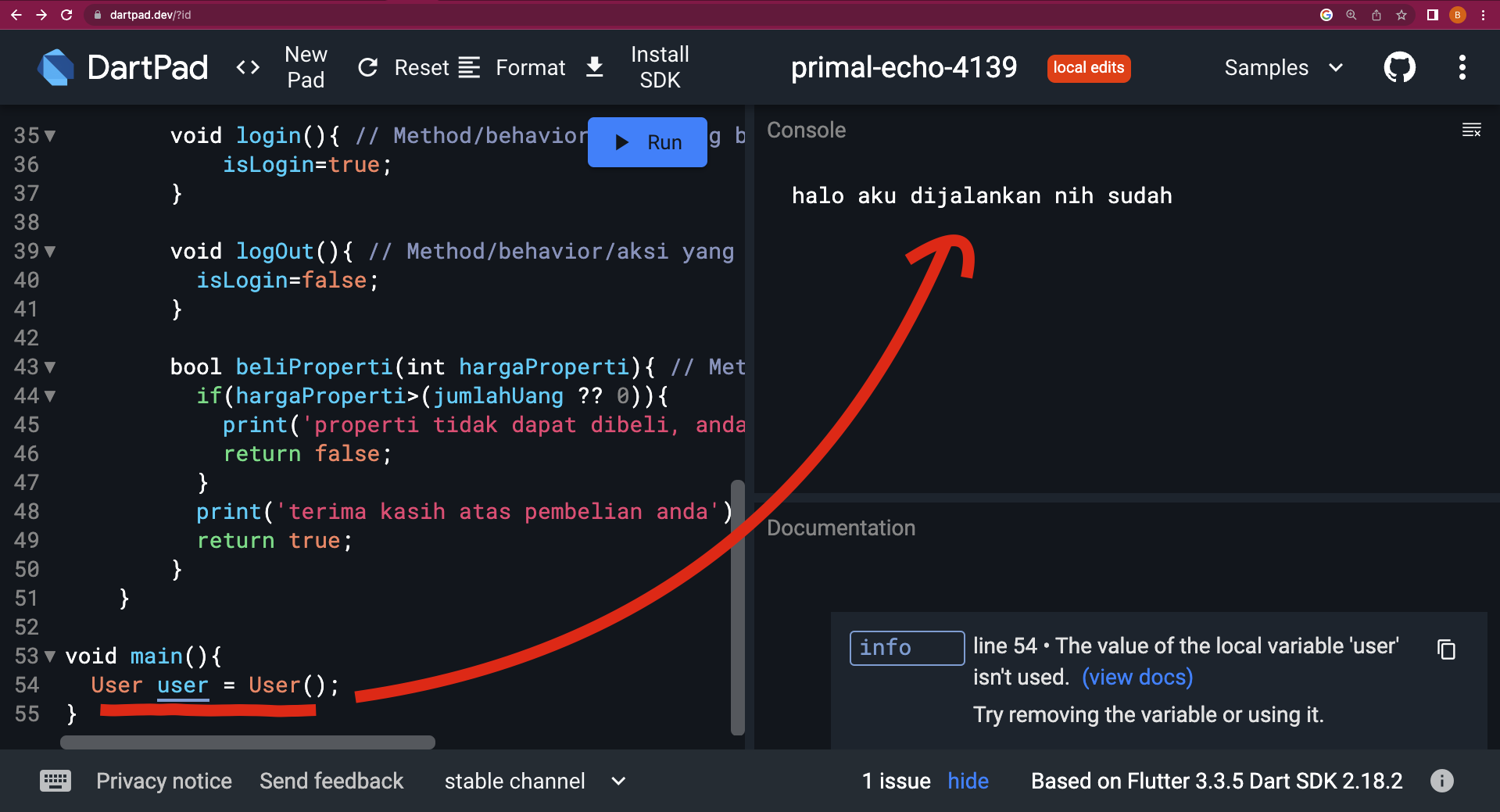 perhatikan tanda panah yang ada pada gambar dibawah ini, kita hanya meng instansiasi saja Class user, namun sudah ada log yang jalan. Hal ini karena kita membuat sebuah log pada constructor kelas User.
